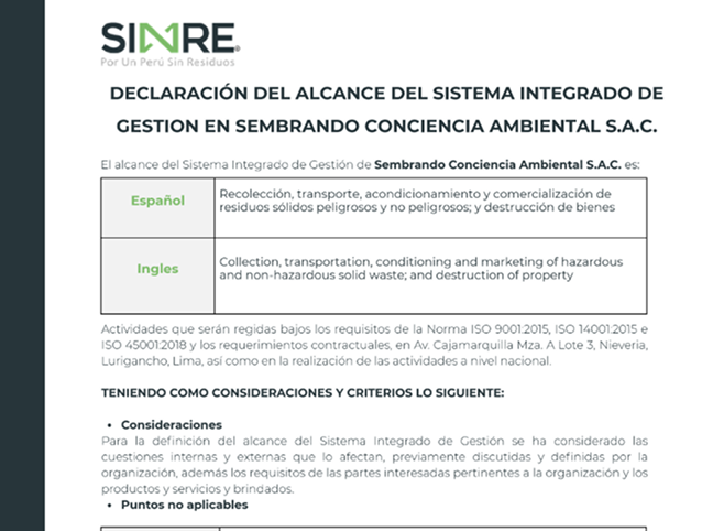 La Declaración del Alcance del Sistema Integrado de Gestión de SINRE define los procesos, actividades y servicios que forman parte del sistema, delimitando su aplicación dentro de la organización y asegurando que cada operación se desarrolle bajo los lineamientos establecidos por las normas internacionales adoptadas por la empresa.