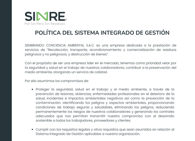 La Política del Sistema Integrado de Gestión de SINRE establece el marco estratégico que orienta nuestras operaciones, reafirmando nuestro compromiso con el cumplimiento de los estándares internacionales aplicables, la mejora continua de nuestros procesos, la protección del medio ambiente, la prevención de riesgos laborales y el estricto cumplimiento de los requisitos legales y normativos vigentes.